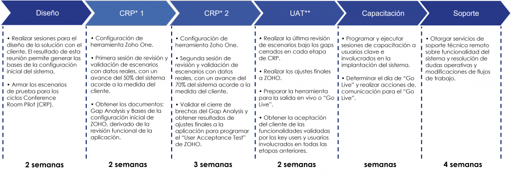 Implementamos Zoho One utilizando la metodología Agile, con entregas a través de Sprints (scrums) semanales.
